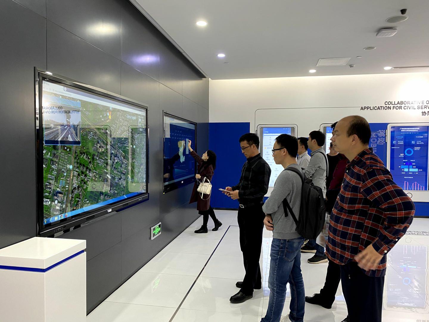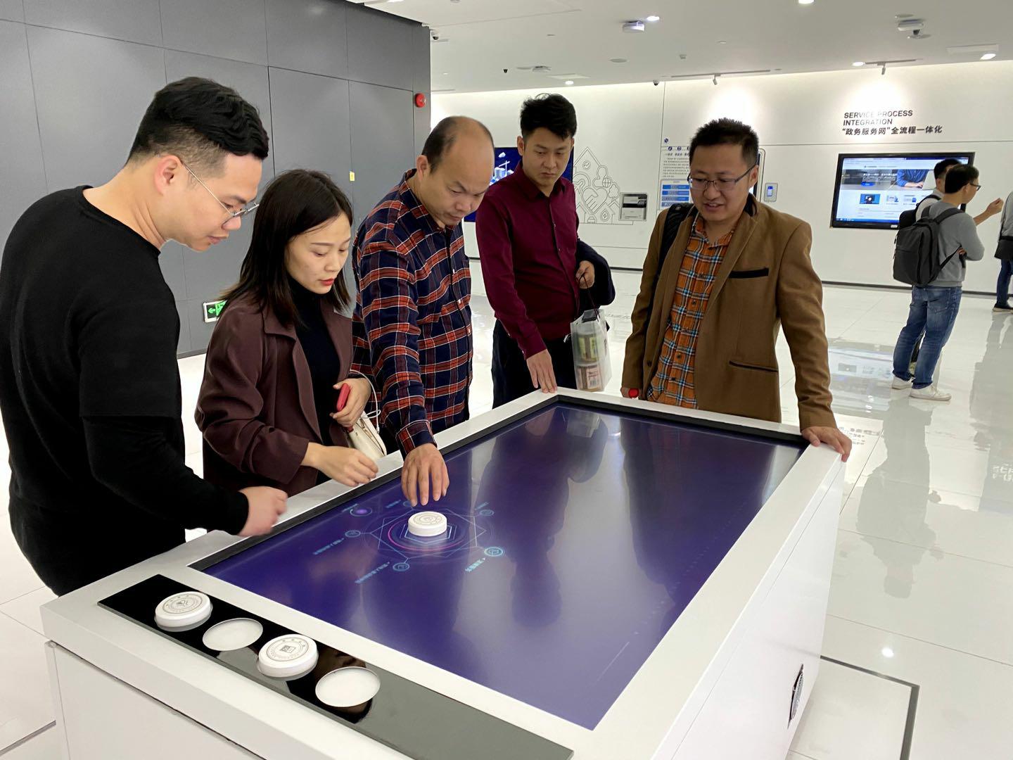 考察组参观了由丝路视觉科技股份有限公司承建的“数字政府”建设运营中心展厅,观看了“数字政府”演示。该展厅运用丰富的多媒体形式,展现“数字政府”的多项应用场景,考察组先后体验了“数字政府”监控指挥区、“粤省事”互动区、广东政务服务网互动区、协同办公平台互动区、“数字政府”创新实践展示区等。在“粤省事”互动区,通过一块移动滑屏的场景交互演绎,参观者可以快速了解交通事故理赔,公积金提取等场景化的服务事项,让大家对“粤省事”的生活场景功能有了更直观的了解。